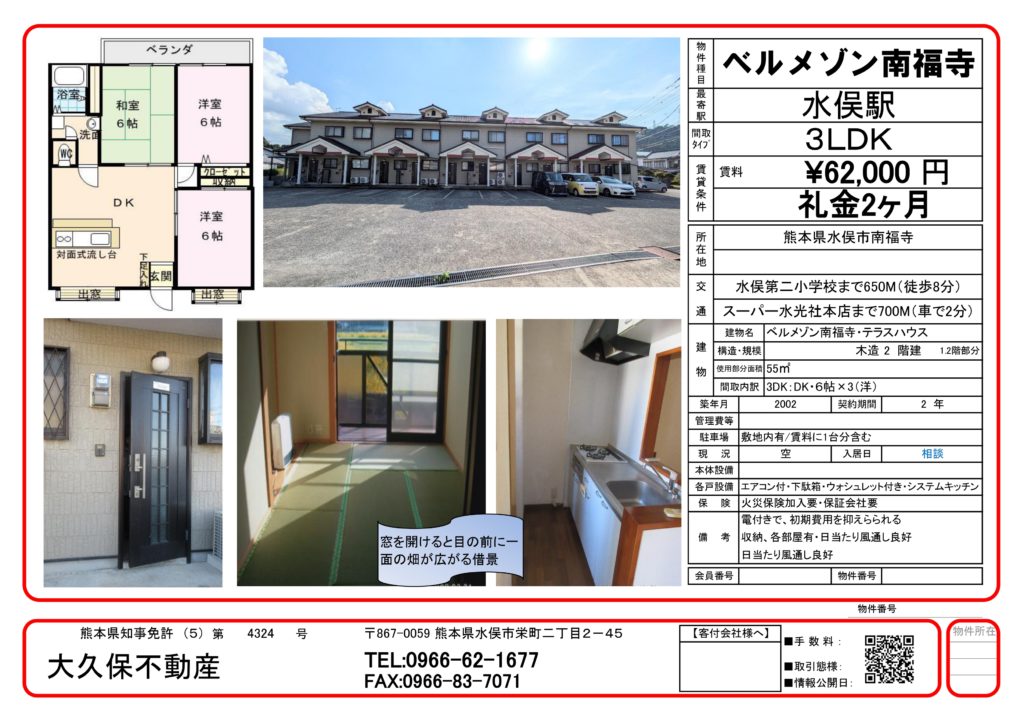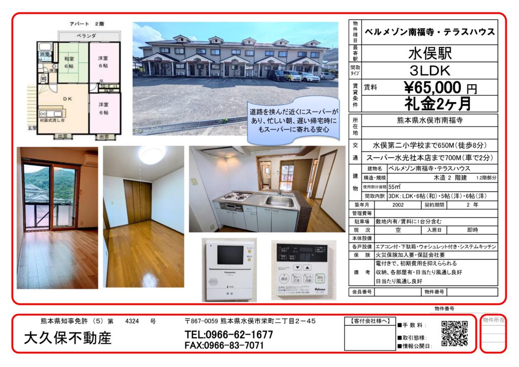 水俣第二小学校まで650M(徒歩8分)・水俣総合医療センターまで1.3K(車で4分)・スーパー水光社本店まで700M(車で2分)・水俣市役所まで1.7K(車で4分)・水俣駅まで2.8K(車で6分)・ロッキー水俣南福寺徒歩1分(道路を挟んだ前)